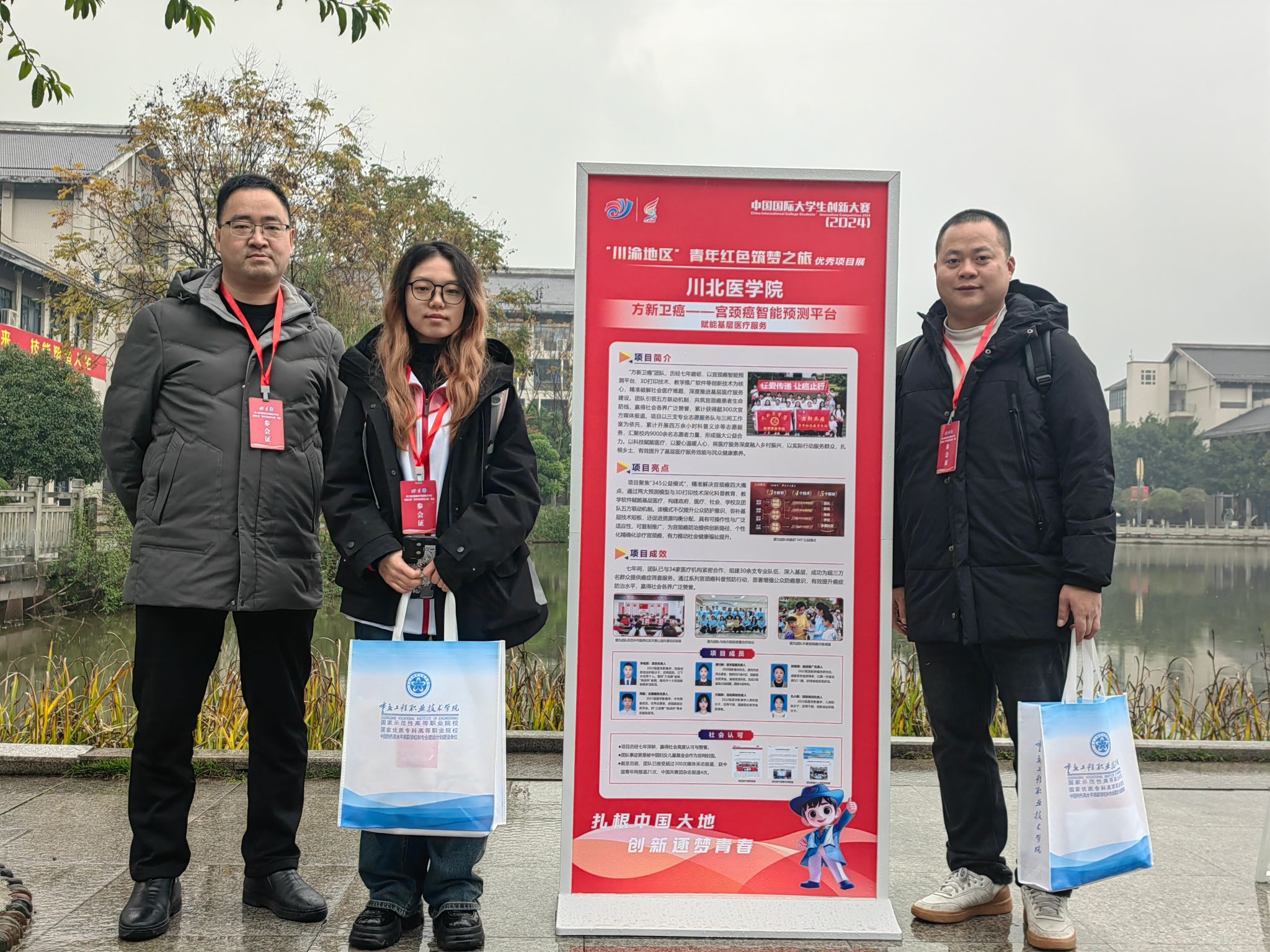 12月13日,第三届川渝地区中国国际大学生创新大赛“青年红色筑梦之旅”活动在重庆工程职业技术学院举行。此次活动由重庆市教育委员会、四川省教育厅主办,重庆工程职业技术学院、西华大学和重庆市学生就业与创新创业服务中心共同承办。我校创新创业学院院长杨晓宏、医学影像学院学生科科长黄正宽和本届大赛省金项目《方新卫癌——宫颈癌智能预测平台赋能基层医疗服务》成员周诣汶参加此次活动。