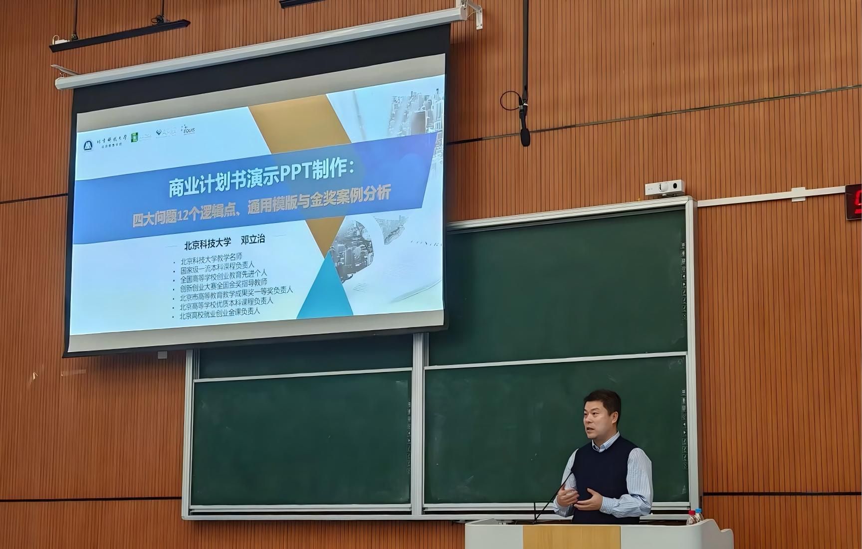 为助力学生提升创赛备赛能力,精准掌握项目展示与材料技巧,11月15日,我校在临江校区松林书院二号楼南105顺利开展了“川贝创谈”系列讲座——《AI赋能商业计划书制作的方法,演示PPT制作逻辑、通用模板与金奖案例》主题讲座。本次讲座特邀北京科技大学经济管理学院副教授、管理学博士、国家级一流本科课程负责人邓立治老师担任主讲嘉宾。