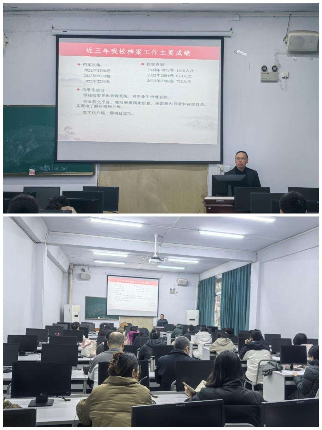 2025年3月28日,图书档案馆组织开展2025年兼职档案员专题培训,旨在加强档案工作规范化建设,提升兼职档案员业务能力,推动档案管理更好服务学校发展。各部门、院系兼职档案员及图书档案馆专职档案员共60余人参加。