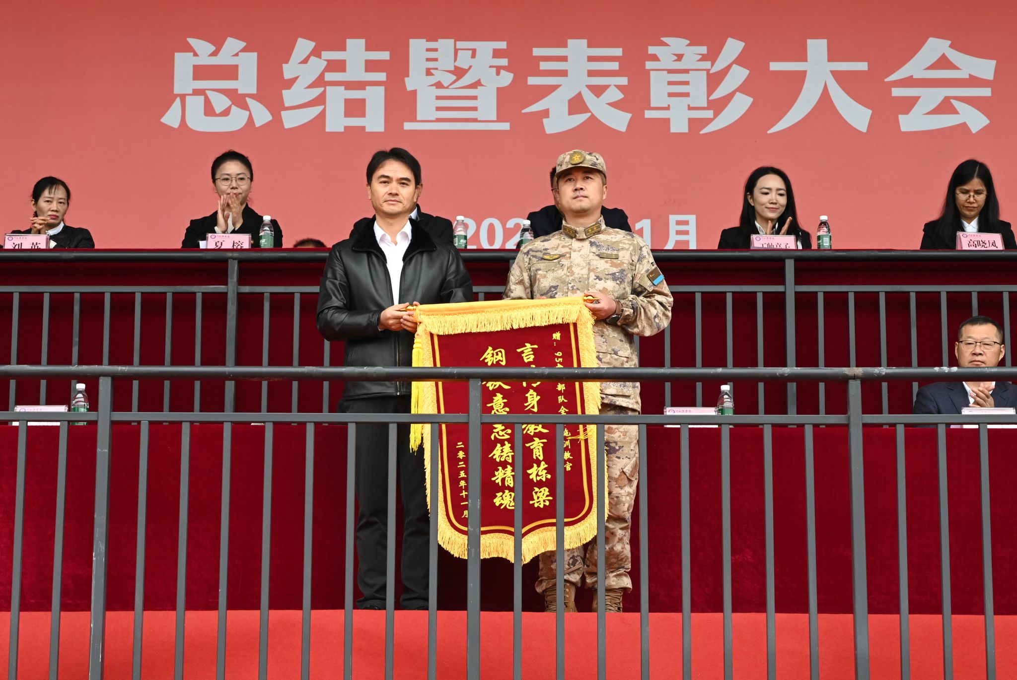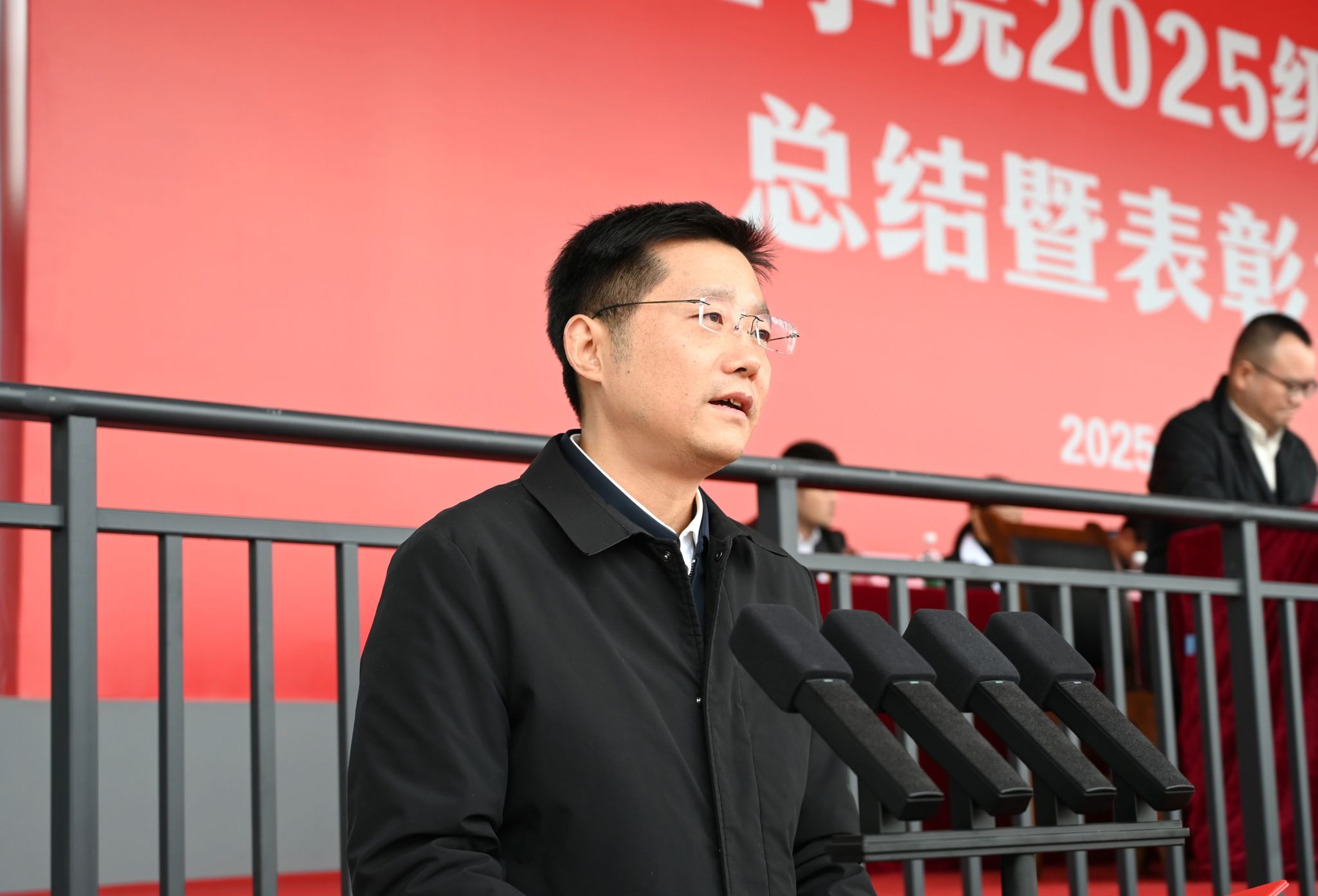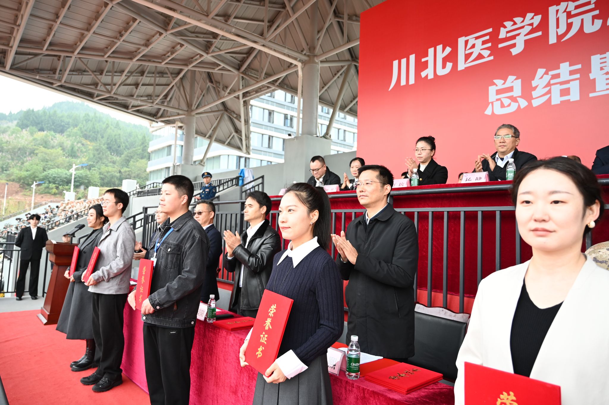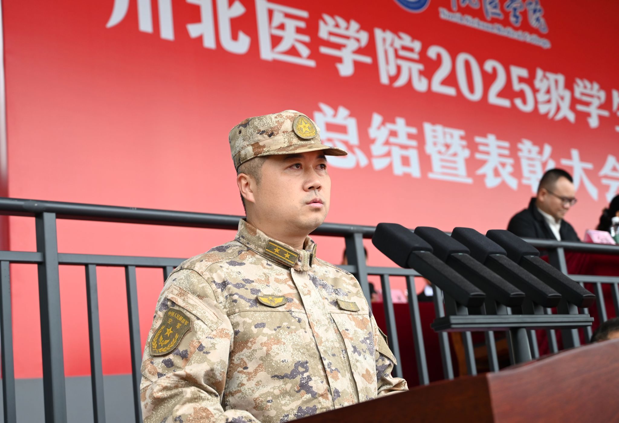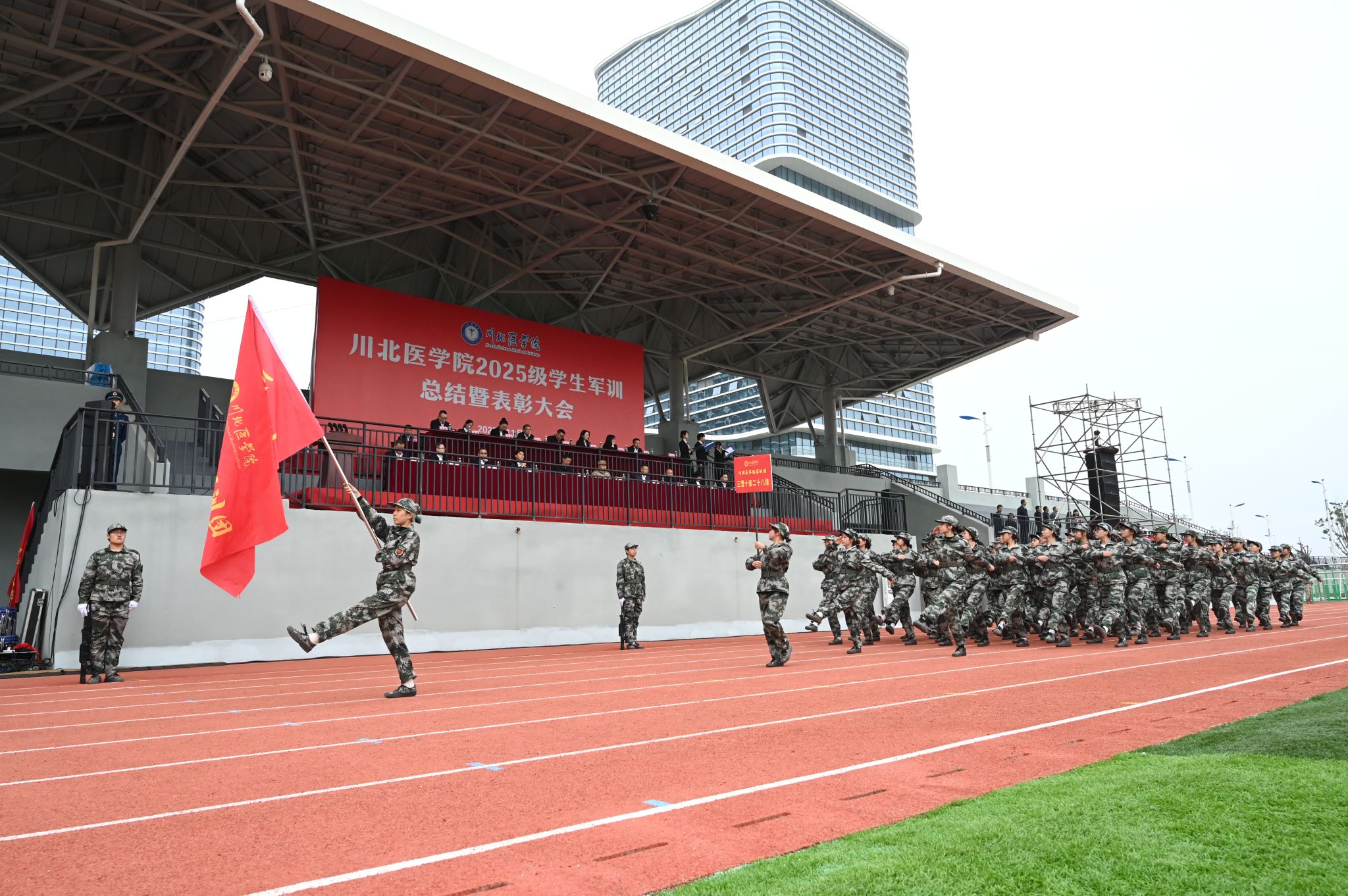 11月3日,学校在临江校区举行2025级学生军训总结暨表彰大会,党委书记古熙,党委副书记、校长代荣阳,承训部队参谋长李震中校,全体校领导,相关职能部门、教学院系负责同志,全体军训教官、2025级新生及辅导员参加大会。