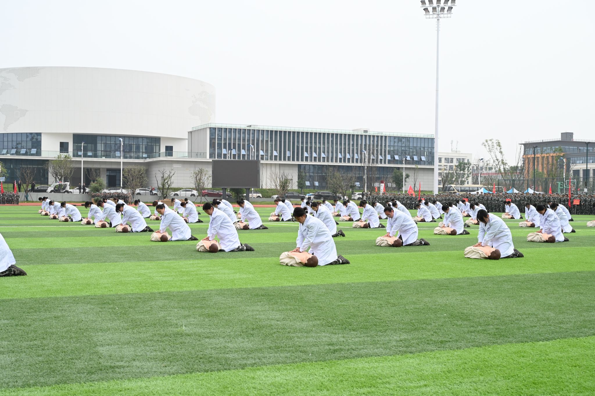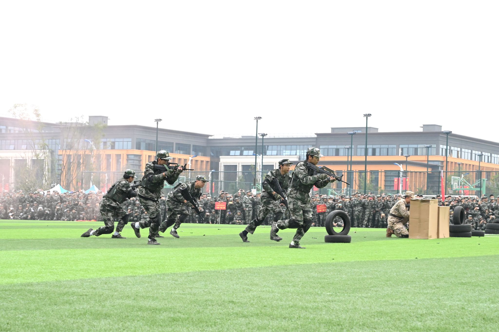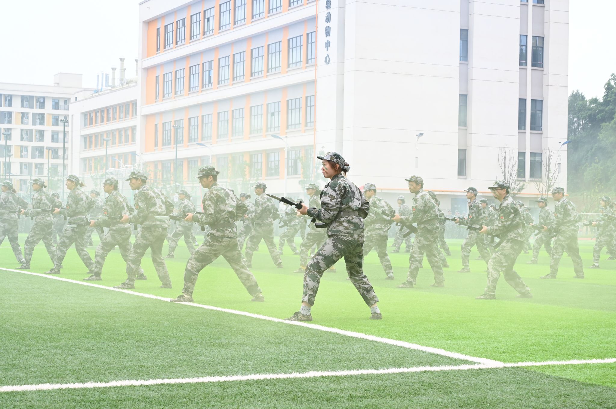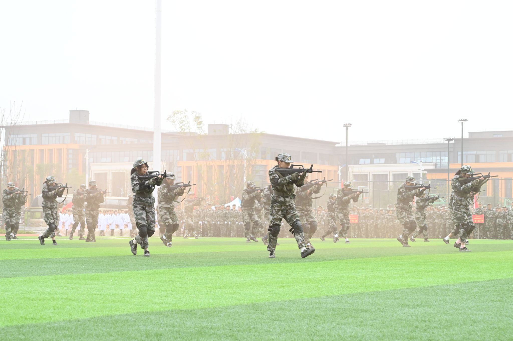 分列式结束后,特色科目汇报展示轮番上演,场面热血沸腾。紧张有序的心肺复苏急救演示、刚劲有力的擒敌拳、气势雄壮的刺杀操赢得热烈的掌声。紧接着一场战术汇报燃遍全场,战术方队持枪入场,突破烟雾迷障,训练有素的动作展现出他们的蓬勃朝气。汇报展示动作规范、气势昂扬、配合默契,全面展现了参训学生严明的纪律观念、扎实的军事素养和显著的训练成效,赢得了现场师生的阵阵喝彩。