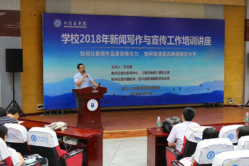 为迎接我校第七次党代会召开,充分展示我校建设发展成果,进一步提升学校各项工作宣传水平,6月11日晚,学校党委宣传部在高坪校区图书信息大楼407教室举办2018年新闻写作与宣传工作培训讲座,特邀南充日报社影视中心、《南充晚报》摄影记者,新华社签约摄影师,四川省新闻摄影学会会员--乐校臣担任主讲。党委宣传部部长杨竹秋、副部长霍学超及我校从事新闻宣传的师生参加培训学习。