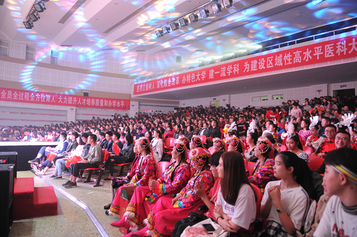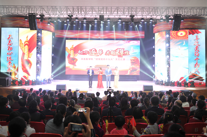 “不忘初心跟党走,喜迎党的十九大”,10月15日夜,川北医欢歌满园,响彻云天,我校师生迎接党的十九大文艺汇演,在顺庆校区世纪会堂成功举行。晚会以“初心逐梦·共创辉煌”为主题,分为“奋斗”、“光荣”和“辉煌”三个篇章。来自教学、医疗、行政管理一线以及离退休的112名老师自发组织、精心策划、认真排练,用一种特别而又充满意义的方式为党的十九大献礼,为校园文化活动增光添彩,以满腔的热情迎接审核评估。