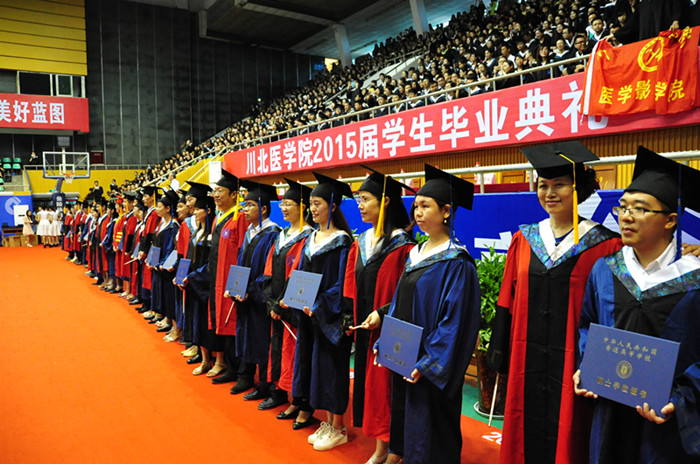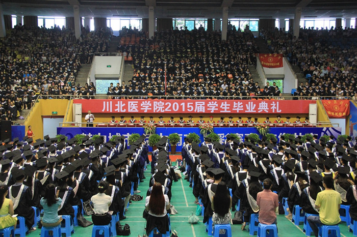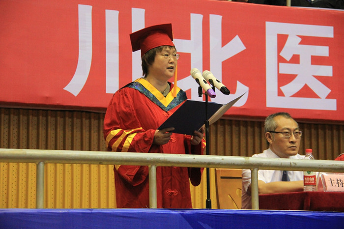 毕业典礼在庄严而雄壮的国歌声中拉开帷幕。副院长雷军宣读《川北医学院关于同意林桐等3155名2015届普通本、专科学生毕业的决定》和《川北医学院关于授予2015届本科毕业生林桐等2785名学生学士学位的决定》。副院长周京国宣读《川北医学院关于授予黄小丽等134名毕业研究生硕士学位的决定》。副院长李健宣读《四川省教育厅关于公布2015届四川省优秀大学毕业生评选结果的通知》。