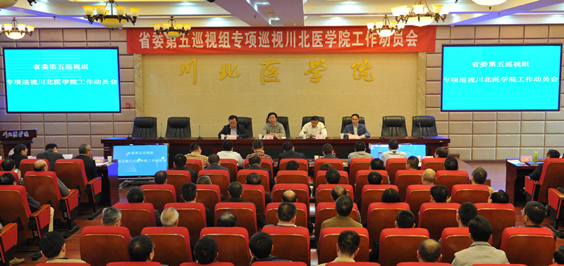 10月26日下午,四川省委第五巡视组专项巡视川北医学院工作动员会在我校顺庆校区科技大楼九楼会议室召开。省委第五巡视组组长向阳就即将开展的巡视工作进行了安排部署。省委教育工委委员、教育厅党组成员李光华主持会议并讲话,校党委书记李成军作表态发言。省委第五巡视组副组长屈刚及巡视组全体成员,省委教育工委领导,学校领导班子成员,全体处级干部,在校的省市人大代表、政协委员及各民主党派负责人,离退休人员及干部职工代表参加会议。