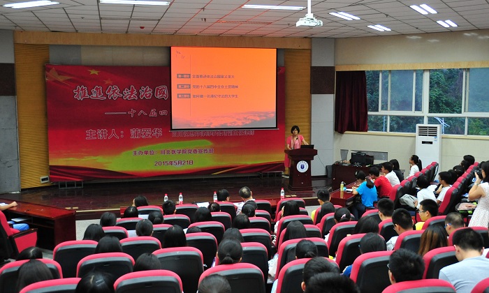 为进一步增强大学生法制观念,提高广大学生守法用法意识,自觉维护法律权威。根据学校“六五”普法规划工作安排,5月21日晚,由学校党委宣传部举办的《推进依法治国 建设法治校园》——十八届四中全会精神解读专题报告会在高坪校区图书信息大楼407教室举行。南充市委宣讲团成员、四川锐思邦律师事务所副主任律师蒲爱华受邀来校,为我校师生作了一场精彩的法制专题报告。南充市司法局局长黄金盛出席报告会并讲话。