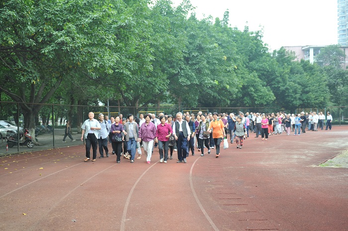 9月29日,离退休处、离退休党总支组织学校离退休老同志240余人在顺庆校区足球场开展了“庆国庆,迎重阳”离退休老同志健步走活动,其中年龄最大的有91岁。行走中,老同志们个个精神抖擞、青春焕发、步履欢快,充分展示了我校老同志健康快乐、积极向上的精神风貌。学校党委副书记杜勇到场祝老同志身体健康,国庆、重阳双节快乐!而后他看望、慰问了老红军遗孀王玉凤,希望她好好保重身体,祝她健康长寿、节日快乐!。