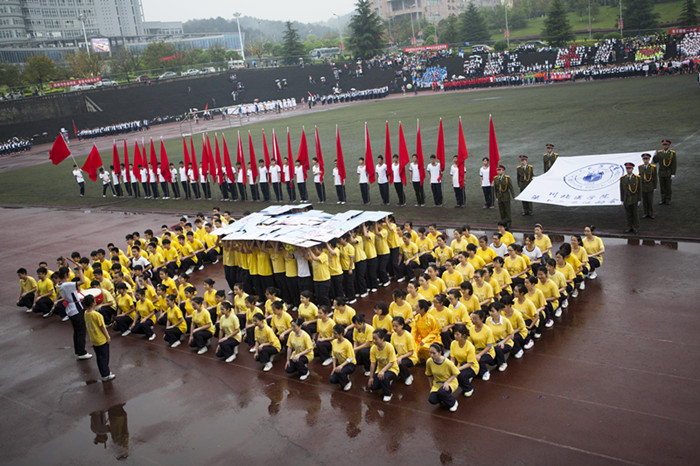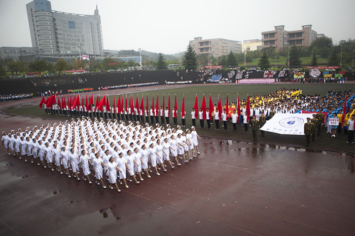 头戴燕尾帽,身着洁白的护士服,护理学院的182名学子踏着矫健的步伐,伴着清脆的口号走向主席台。她们以手中的红、黄、蓝、绿四色翻花不断变换,首先摆出“红色十字架”,展示了护理人员志愿博爱的精神。接下来拼出多彩“5·12”,弘扬南丁格尔毕其一生奉献予护理事业大爱无私的品质。最后,展示的翻花“快乐运动场”分别代表绿色足球场、红黄色跑道,流动的色彩如同奔跑的青春,展现了护理学子积极向上、敢于拼搏的精神风貌。