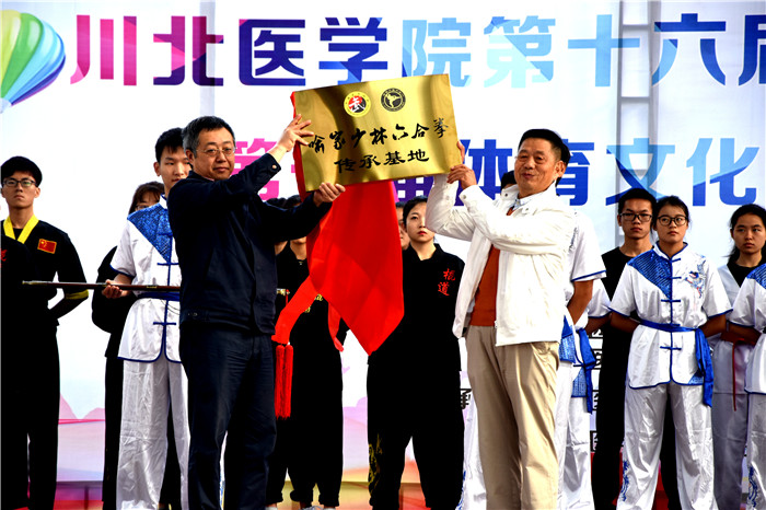 随后举行“非遗进校园”揭牌仪式,学校副院长、体育运动委员会主任罗加福和84岁高龄的喻家少林六合门第八代掌门人、南充市非物质文化遗产传承人刘朝贵共同为“喻家少林六合拳传承基地”揭牌。