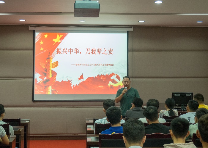 基础医学院党总支副书记林锋指出,我们要坚决贯彻落实习近平总书记“青年时代,选择吃苦也就选择了收获,选择了奉献也就选择了高尚”的重要指示,应当秉承爱国奉献、开拓创新、艰苦奋斗的精神,在自己的岗位上认真学习、工作,恪尽职守,以黄大年同志为榜样,党员同志要争做合格、优秀的共产党员,入党积极分子、学生骨干要努力向优秀党员同志看齐、对标,积极向党组织靠拢,争做合格党员接班人,献身中华民族的伟大复兴事业!