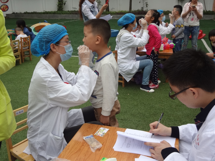 活动在《我要刷牙》和《洗手歌》的歌声中拉开了序幕。志愿者们分工明确,2011级志愿者耐心为小朋友检查牙齿,2012级志愿者负责填写儿童口腔调查问卷,2013级志愿者在维持秩序的同时教授小朋友们正确的刷牙和洗手方法。整个活动井然有序又充满欢声笑语。本次活动共填写调查问卷280余份。幼稚园的园长和老师们纷纷表示学习到实际有用的口腔保健知识,日后要让老师和家长们更加注意孩子的口腔健康,树立正确的口腔保健意识。
