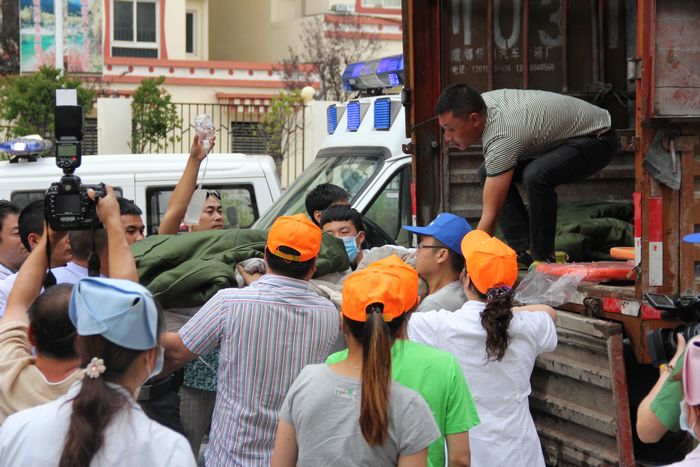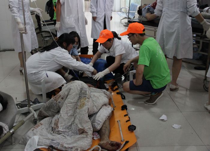 生们立即投入战斗。学生与医生们一起帮助伤员从救护车上转移到担架上,又迅速的抬着担架把病人转移到病床上,而鲁桂英、任华蓉两位老师则以专业知识进行抢