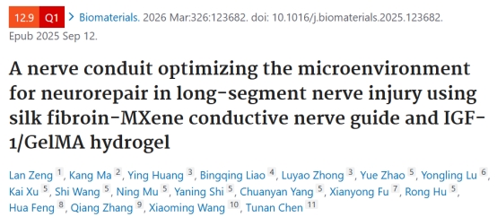 近日,我校神经病学硕士研究生曾兰同学在导师王晓明教授与陆军军医大学陈图南教授的指导下,以第一作者在国际生物材料权威期刊《Biomaterials》上发表了题为”A Nerve Conduit Optimizing the Microenvironment for Neurorepair in Long-Segment Nerve Injury Using Silk Fibroin-MXene Conductive Nerve Guide and IGF-1/GelMA Hydrogel”的高质量科研论文。该研究针对周围神经长段缺损修复中再生效率低、功能恢复受限等关键临床挑战,创新性地构建了一种具备电-化学双模调控功能的复合再生系统,为神经修复材料的设计提供了新思路。该研究成果今年6月在江西省南昌市举办的第十八届中国医师协会神经内科医师年会进行了大会学术报告。