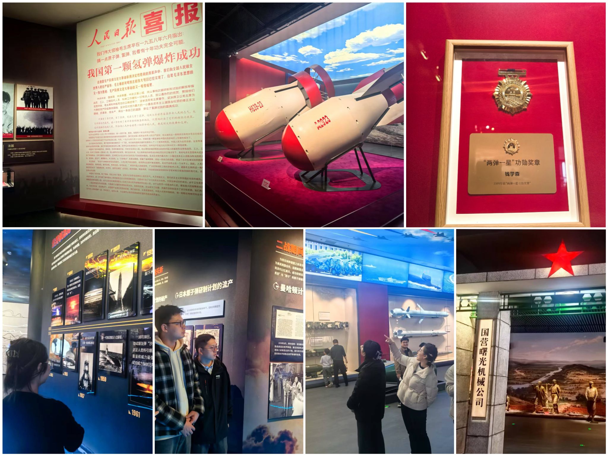 活动过程中,师生们先后参观了两弹历程馆、将军楼、邓稼先旧居、三防教育馆等“两弹城”各个展区。展馆内陈列的大量珍贵历史照片、手稿文献和科研实物模型,将大家带回到那段封闭艰苦却激情澎湃的岁月:从铀矿勘探、理论验证的实验装置,到1:1还原的原子弹和氢弹模型,一幕幕历史场景生动再现。讲述着“争气弹”从无到有的研发历程,播放核试验影像资料时,现场师生无不为之震撼。大家时而驻足凝视,时而低声交流,真切感受着新中国从“一穷二白”发展“两弹一星”的光辉历程,对老一辈科学家“干惊天动地事、做隐姓埋名人”的无私奉献精神有了更深刻的体会。通过参观学习,师生们更加直观地领悟了什么是“艰苦奋斗、自力更生”,更加真切地体会到老一辈国防科技工作者舍家报国的家国情怀。