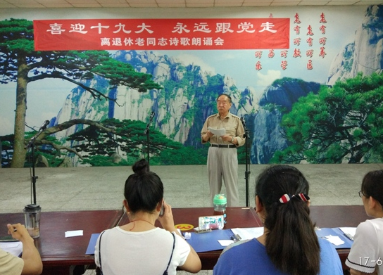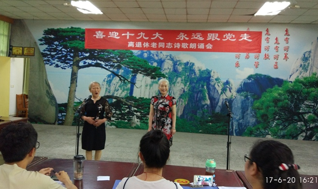 6月20日,在中国共产党成立96周年到来之际,离退休党总支、工作处在老年活动中心开展了“喜迎十九大、永远跟党走”主题诗歌朗诵会,60余名离退休教职工参加了活动。
