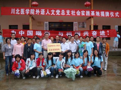 为大力创建“推动发展能力强,服务群众能力强、凝聚人心能力强,促进和谐能力强”的基层组织,实践科学发展观,努力提高大学生思想政治素质, 8月28日,在濛濛细雨中,外语人文党总支与仪陇马鞍镇政府共同举行了“川北医学院外语人文党总支社会实践琳琅基地揭牌仪式。”仪式由外语人文党总支外语教工第一党支部支部书记李芋均老师主持。马鞍镇镇长郭斌与学院组织部副部长杨纯良共同为社会实践基地揭牌。
