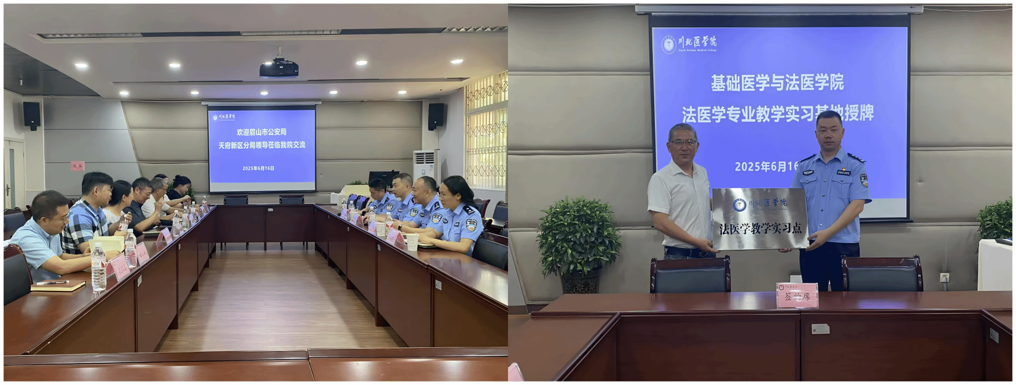 6月16日上午,基础医学与法医学院和眉山市公安局天府新区分局联合共建法医学教学实习点揭牌仪式在基法学院学术厅举行。基法学院党委书记兰海涛,院长杨健,眉山市公安局天府新区分局副书记、政委钟兴伟等出席仪式。