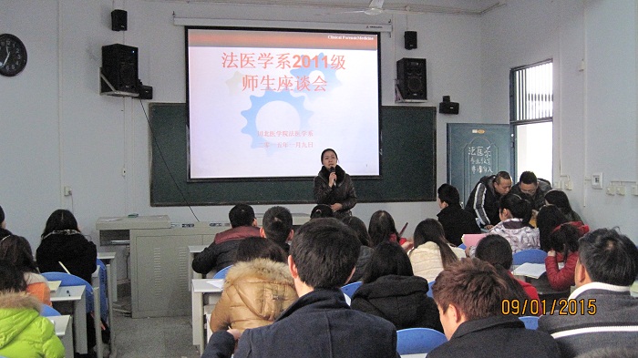 为促进教学改进,提高教学质量,了解学生的意见、要求和建议,2015年1月7日上午10时,法医学系在二教405召开了师生座谈会,座谈会有法医系副主任杜冰主持,我系教授委员会成员、各教研室和科室负责人、法医2010级2011级全体学生出席了会议。