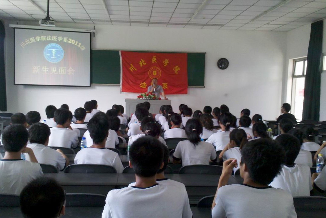 下午17:00召开我系2011级新生见面会。基础医学院院长、系主任张波,副主任吴松、杜冰等系部专家及全体2011级新生、系学生会部分成员参加见面会,系学生会主席姜昊担任主持人。见面会上,老师和同学们自我介绍,语言幽默风趣,气氛轻松而热烈。系主任张波对2011级新同学的到来表示热烈欢迎,他简单介绍我系基本情况,希望同学们珍惜大学时光,努力学习,快乐成长,并承诺将尽全力为同学们提供优良硬件平台,帮助同学们成才。副主任吴松围绕“什么是法医?”这个问题,简单阐述了法医的发展、分科、任务等,他提出同学们在学习好专业知识的同时,要多了解法律和刑事技术的其他知识,还要广泛涉猎各门学科,全面提升综合素质。副主任杜冰则提醒同学们在学习中应及早树立目标,合理安排自己的学习、生活。最后,系学生会主席姜昊为新同学讲解我校社团活动和学生会工作等相关情况,鼓励大家积极参加各种社团组织,提高自身素质,展示个人风采。