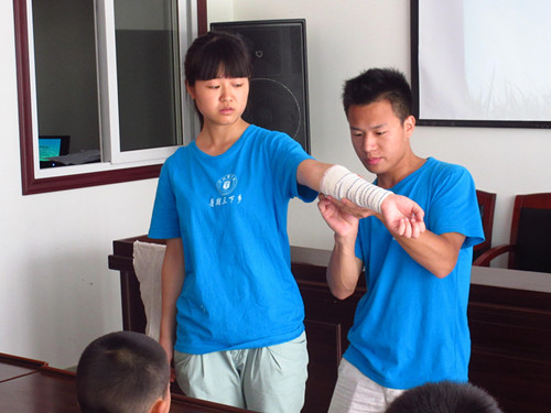 上午9点,急救知识讲座正式在和欣家园社区便民服务中心的会议室开始,由服务团带队老师魏莹老师主讲,部分队员则做相关现场演示。讲座首先为小区居民讲解夏日常见的突发事件及其紧急处理方法,如:游泳时溺水该如何处理,烫伤时该如何处理,大出血时如何及时恰当的止血以及出行时的交通安全问题等。之后,服务团队员手把手地教授社区中的同学三角巾和绷带的使用方法,身体力行,使前来的人们大都掌握了各种急救相关知识的要点。最后,队员通过形象的图片与生动的语言讲解了心肺复苏术。这在特殊的紧急情况下是一项必备而实用的技能。