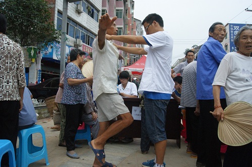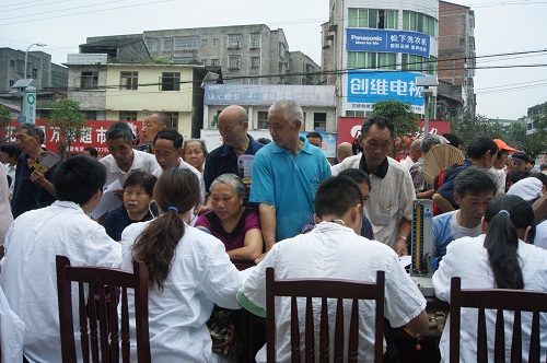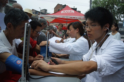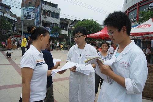 志愿服务活动已进入第五天,有前期调查及宣传工作为基础,群众对服务团的认可度和美誉度都很高,义诊活动还未正式开始,现场已是人群涌动。义诊活动项目包括基本健康状况登记、视觉、嗅觉、血压、脉搏、平衡度检查等,执业医师则向群众提供健康咨询和初步诊断。接受义诊的群众,上至90高龄的老人,下至几岁的孩童,有镇上的居民,也有知道消息专程从乡下赶来的农民朋友。“是,他们是免费帮我们体检的”,“年轻人啊,感谢你们了”,“我娃娃也在川北医学院上学呢,就是他们学校”……活动现场,人声鼎沸,总能听到这些振奋队员精神的话语,队员们鼓足干劲,将学到的知识发挥尽致,一刻不停的进行着检查和耐心的讲解:引导员穿梭于人群中维持秩序,不时搀扶行动不便的老人;体检表登记队员大声的向群众提问、解释,好几名队员声音嘶哑;在嘈杂的人声中测量血压需要高度集中精力,本着对群众负责任的态度,队员们不敢有丝毫放松,这几名队员累了,又换另一批,先后换了三次,最大限度的保证为群众准确测量……队员们用自己的表现让群众深切感受到他们无私奉献和真诚服务的心,义诊现场始终秩序井然,有条不紊,群众积极配合队员们的协调,耐心等待接受检查,周围的商贩店员们,时不时的拿来矿泉水,租赁桌椅的大叔问了一句“你们就是来搞免费义诊的啊?”当得到肯定回答的时候,他大方的表示,自己也要出一份力,无偿提供桌椅使用……这一切,让队员们感动不已,淳朴的老百姓,你对他们好一点,他们就会百倍的回报,他们都是最可爱的人!