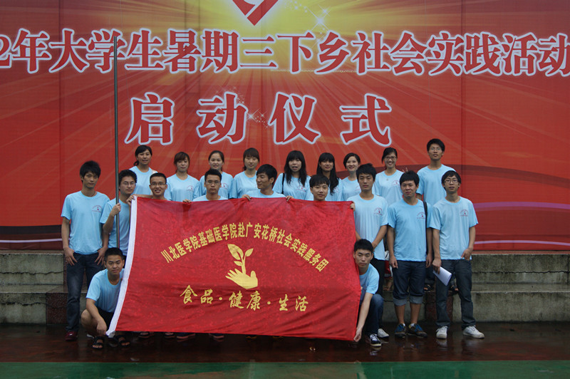 7月3日上午8:00,学院2012年暑期“三下乡”社会实践服务活动启动仪式隆重举行,康健等学院领导莅临现场。奏唱国歌、志愿者宣誓仪式后,院团委书记汪小平对今年我院下乡队伍情况和下乡过程中要注意的问题做简单介绍,包括我系团队在内的数十名志愿者代表上台接受授旗。随后康健院长讲话肯定了我院近年暑期“三下乡”实践活动所取得的成绩,并对今年的队伍寄予厚望和诚挚的祝愿,最后仪式在青春激扬的歌曲中圆满结束。至此我系组建的赴广安花桥“食品·健康·生活”社会实践服务活动正式启动。