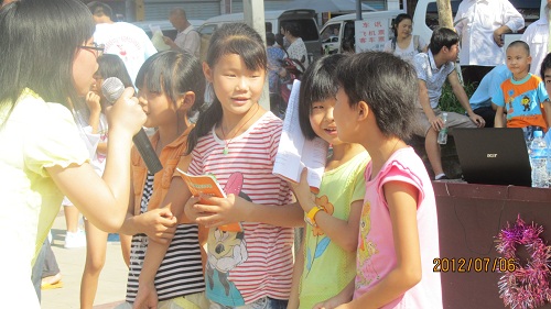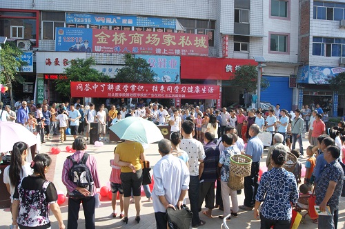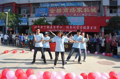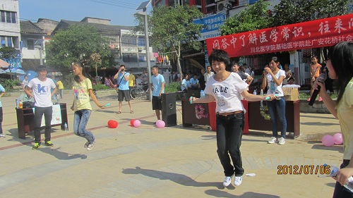 恰逢场镇赶集,活动还没开始,广场上已聚集很多群众,队员们借机向他们分发宣传资料,讲解健康知识。8:30,在一段轻松活跃的舞蹈中,活动拉开序幕,队员们尽情展现自己的青春活力,天气十分炎热,而队员们仍激情高昂,赢得台下群众的热烈掌声。疾病与健康相关医学知识问答环节中,在主持人的鼓励下,数名群众上台回答问题,在一问一答中了解、熟悉了医学常识,贴心的小礼品让参加活动的群众笑逐颜开。在队员们精心准备的文艺节目《知心爱人》插入后,进入紧张的“你比我猜”和抢答环节,群众朋友们踊跃参与,既学到了健康知识,又得到实惠的小奖品。队员曹焱独唱的《新贵妃醉酒》,将现场气氛进一步推向高潮,随后的跳绳等有益身心的趣味运动比赛,小朋友、老人纷纷上场,与队员们一起,同运动同快乐。最后在《同一首歌》的优美旋律中,主持人再次向群众们介绍本次活动的主题、目的和主要工作,在一片掌声和赞誉声中,本次趣味活动顺利结束。