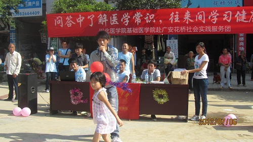 为了进一步走进群众,服务群众,让更多的人熟悉生活中的医学常识,7月6日,川北医学院赴广安花桥社会实践服务团在镇广场开展以“健康饮食和食源性疾病”为主题的趣味活动。