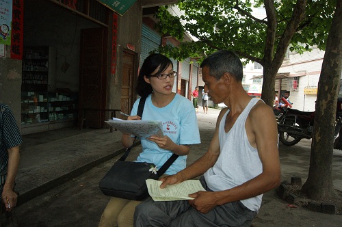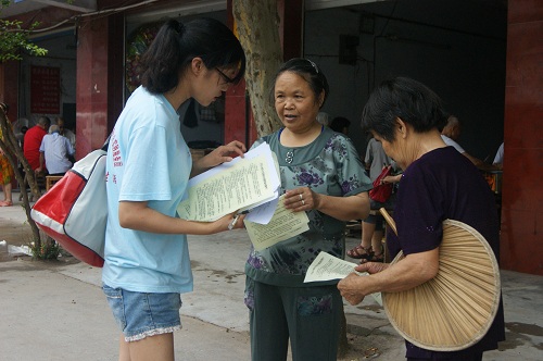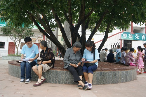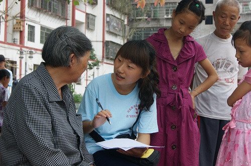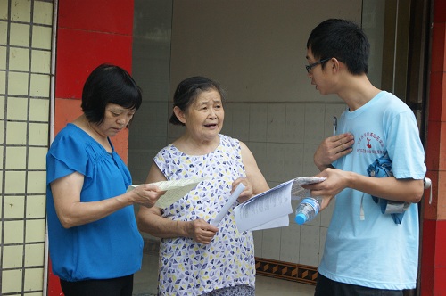 面对花甲老人,队员们充满热情,饱含耐心,老人们大多年事已高,或听力不便,或视力不佳,或不能识字,队员们以通俗易懂的话语,简单明了的提问,尽可能大声的给老人们讲解,经常还要将嘴贴近老人们的耳朵讲解,保持这样的姿势让队员们腰腿酸痛,但他们仍然坚持着,不怕苦、不怕累,尽心尽力将工作做好。面对中年人,队员们如面对自己的父母,亲切、贴心,他们一边开心地与叔叔阿姨聊天,一边进行问卷调查,宣传健康知识。活泼的小朋友们充满了童真,无忧无虑,队员们温和的引导着他们,在欢声笑语中完成工作。