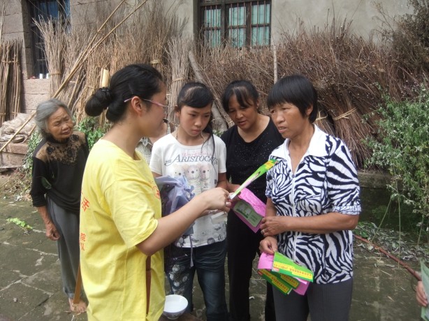 早上八点,经过简短的会议后,大家整装出发。过嘉陵江后经约二十分钟车程,队员们来到街子场镇。在当地团委的带领下,队员们首先在街子场镇上仔细地对赶集的群众做了问卷调查。与此同时,队员们也耐心地向大家讲解健康饮水知识。考虑到街子镇周边村落人口密度不大,间距较远,三个调采小组即沿公路从场镇出发,分别朝着不同方向深入到街子镇2村、10村、11村和柏树桠村。一路上,队员们既做问卷,又采集居民饮用水样品,同时也向他们讲解有关如何科学健康饮水的知识。