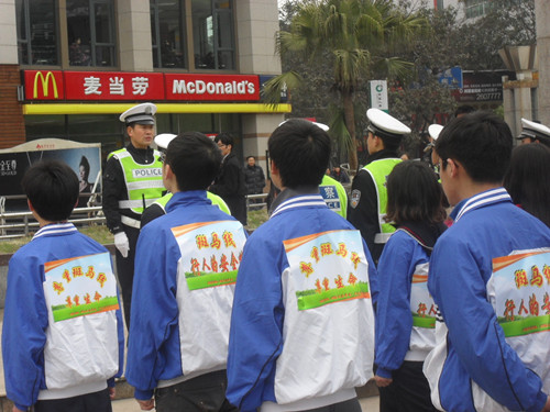 我系2008级联合2009级护理7班和川北志愿者服务队,共计约一百名同学在顺庆区交警一大队张队长一行六位交警同志的带领下走上五星花园、人民花园和市中心四大主干道的各红绿灯路口义务执勤,倡导市民文明交通。同学们不畏过往车辆扬起熏鼻的尘土,不去在意部分缺乏交通意识市民投来的各种眼神,坚守岗位,默默奉献,让过往的行人和车辆通行得井然有序。与此同时,他们还充分发挥当代大学生的专业素质,为广大驾驶员朋友宣传讲解醉酒驾车的危害及刑法规定酒驾将承担的后果,并向他们发放了两千余份防止醉酒驾车方面的小资料。