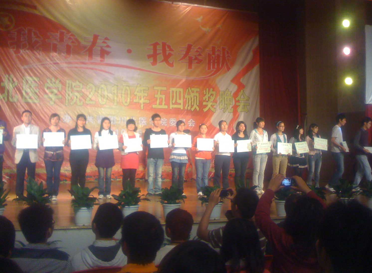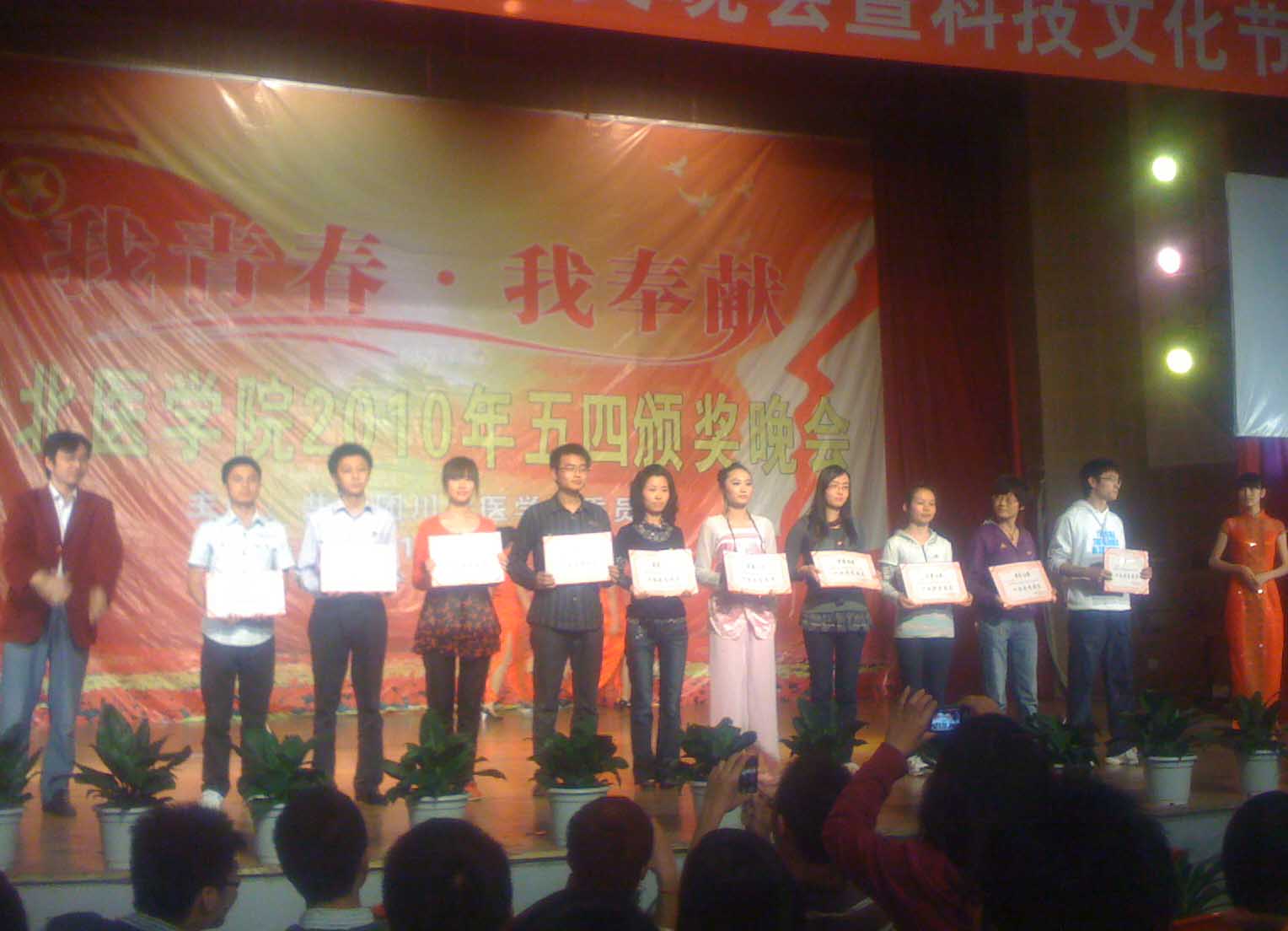 2010年5月10日,由院团委主办的2010年五四颁奖晚会暨科技文化节闭幕式在我院西区世纪礼堂隆重召开,学院党委书记凌保东、副书记李成军等领导和各党总支、团总支负责人到场。我系2007级何冠军获校“十佳共青团员”、2008级孙红梅获校“优秀共青团干部”,2006级王登平等8位同学获校“优秀共青团员”、2008级第一团支部获校“红旗团支部提名奖”,尤为值得一提的是,2006级何志明等同学撰写的《南充市城乡母乳喂养现状及影响因素对比》获2009年学生社会实践论文三等奖。在各奖项都有斩获的我系同学还为晚会带去了精彩节目,2007级王晨阳等同学演唱的一曲《还我蔚蓝》将晚会气氛推向高潮。祝贺各位获奖同学,希望在未来的学习生活中,我系同学再接再厉,创造更多佳绩!