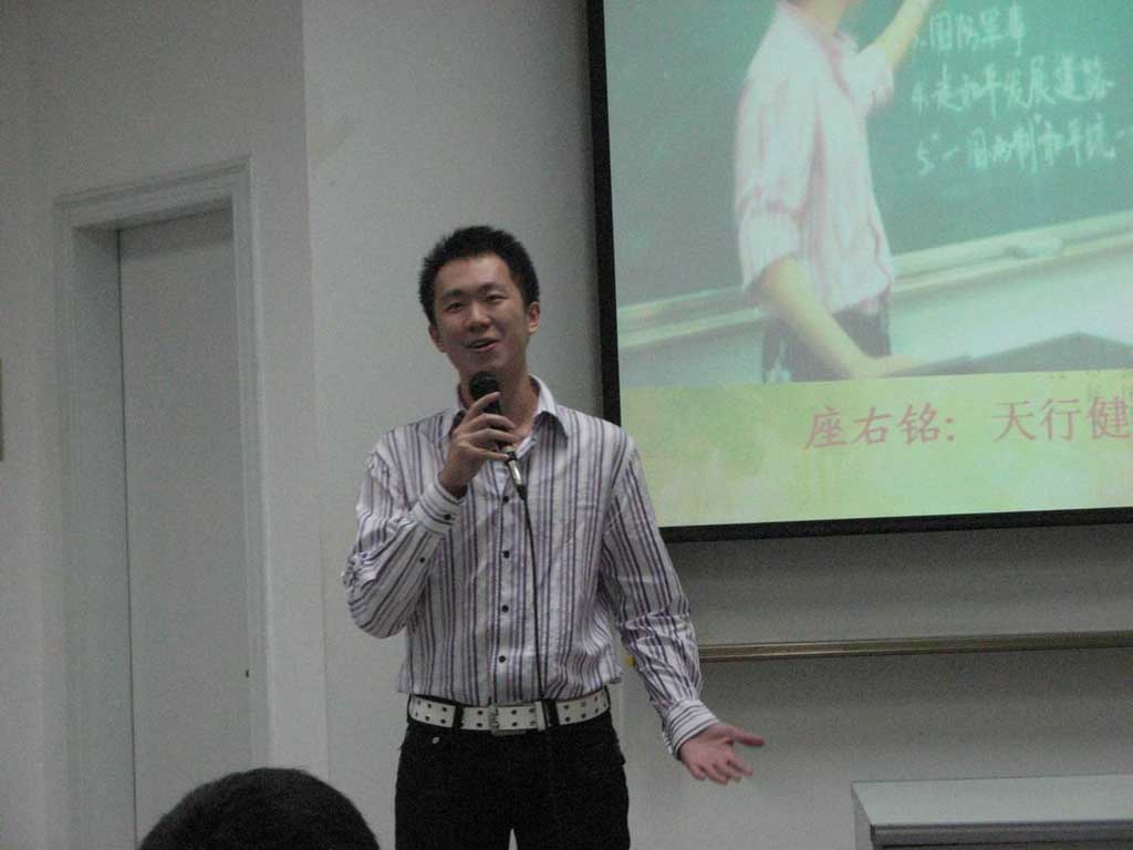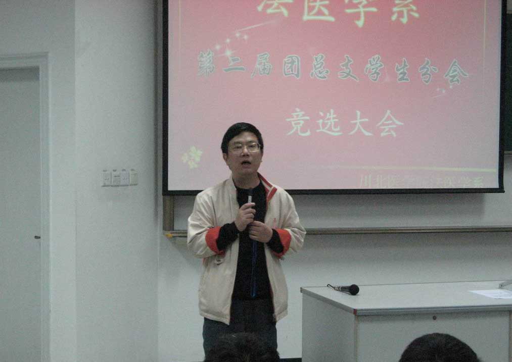为完善学生管理,加强交流,增进师生情谊,我系于2009年10月18日晚7:00在西区第一教学楼201教室进行第二届法医系团总支学生分会的竞选。南充市公安局物证鉴定所所长、法医系副主任吴松老师,法医系教务科科长杜冰老师等法医系老师及全体学生参加了大会。