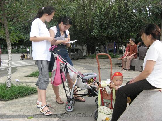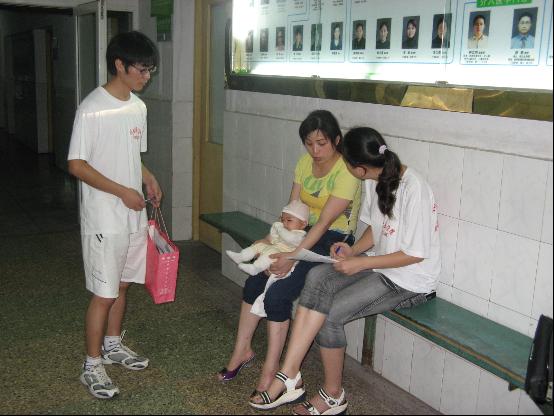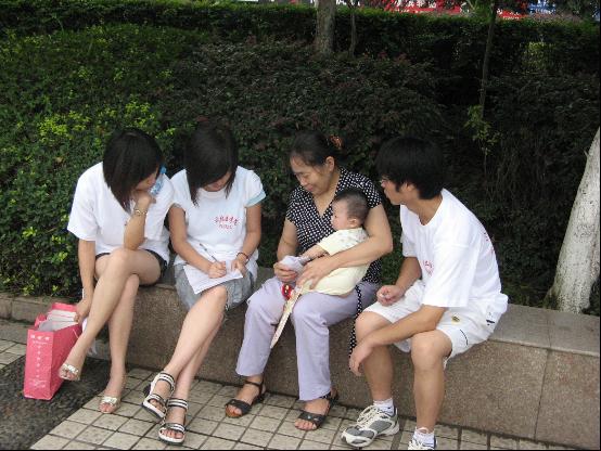 我队先分为两小队,分别到南充市中心医院和市五医院做有关“母乳喂养”的知识普及和相关社会调查。一路上我们遇到很多困难,如家长忙于给孩子看病而无暇回答我们的问题等,但大家集思广益,对遇到的问题提出了避免和解决的方案。在第一天,两队人员一共完成了23份问卷,基本完成任务。