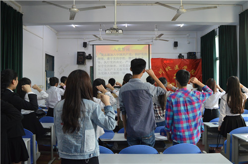 大会伊始,全体党员、预备党员以及所有积极分子面对党旗,举起右拳,庄严宣誓。接着,曾恩泉同志以“两学一做”为基础,给同学们讲解了如何做一名合格的共产党党员,他强调要抓思想、重品德、守纪律、有作为,要严在平时,做好身边同学的表率。随后,预备党员向组织做了近期的思想汇报,拟发展对象逐一讲述了自己的入党志愿、入党决心和愿望。