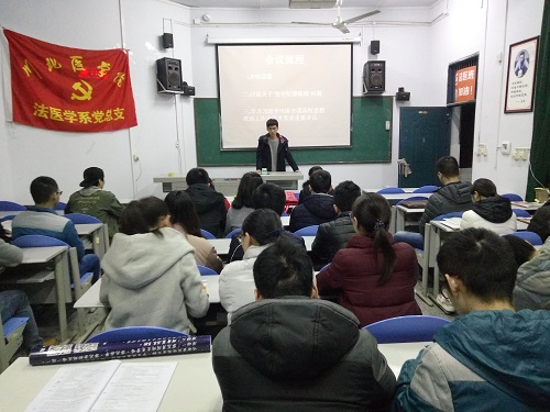 12月15日晚,法医学系学生党支部在顺庆校区第二教学楼405召开了以“学习习近平总书记在高校思想政治工作会议上的讲话”为主题的党支部大会,法医学系学生党支部书记金波、辅导员田馨雅以及法医学系全体党员、预备党员参加了此次大会。