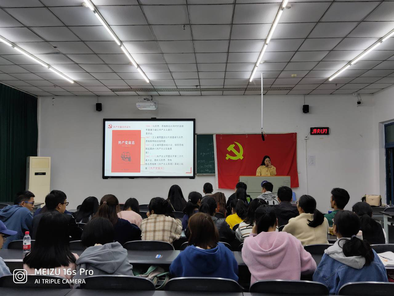 会上,主讲人夏敏从《共产党宣言》的四个方面分享学习,简要介绍了《共产党宣言》的诞生历程及发展完善,并学习了《共产党宣言》四个章节的主要内容。夏敏指出共产党宣言对中国共产党人的重要性,它说明了中国共产党的性质、特点,规定了共产党的理论和纲领。她阐述了宣言中共产党人革命斗争的思想策略,提到共产党人努力全世界争取民主政党之间的团结协作。最后,她讲到了习总书记在马克思诞辰二百周年的讲话,并提醒同学们要时刻铭记和学习马克思主义精神。