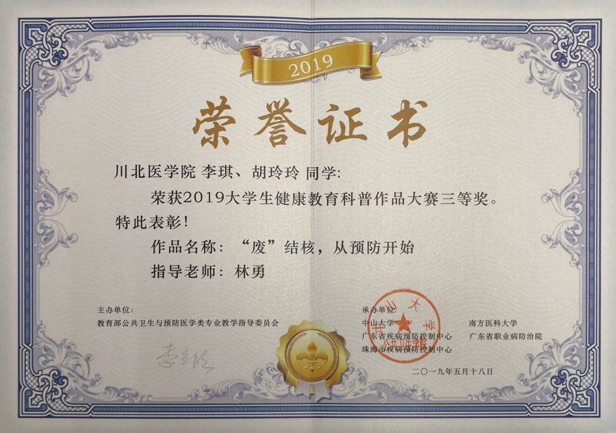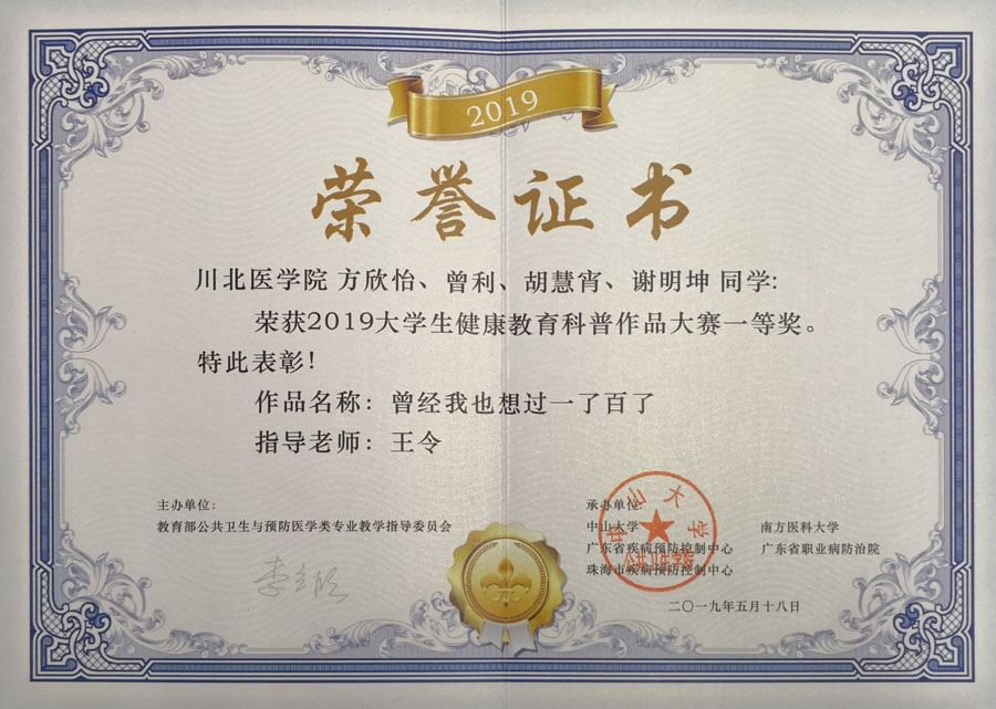 5月18日,第二届全国大学生公共卫生综合知识与技能大赛在珠海举行。比赛期间,公布了2019年全国大学生健康教育科普作品大赛结果。由我校预防医学系、四川省基层卫生事业发展中心共同选送的两幅学生作品喜获一等奖和三等奖。