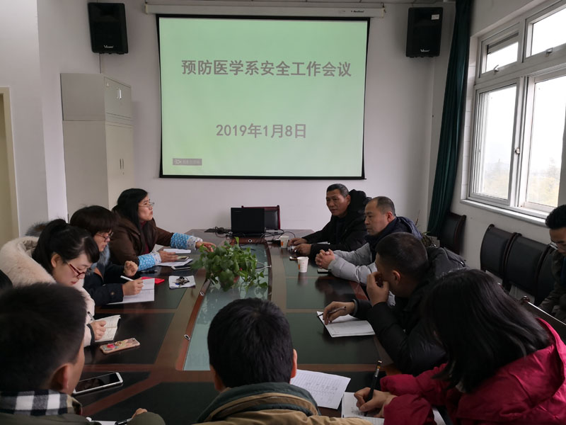 为提高预防医学系老师的安全意识,普及安全知识。1月8日下午,预防医学系在系会议室召开安全工作会议。本次会议特别邀请到保卫处朱红兵科长及石鹰老师出席,预防医学系高晓凤主任及全体老师参加了本次会议。会上,朱红兵科长首先向大家详细介绍了近年来高校安全事故发生的案例、火灾逃生要点等内容,并就干粉灭火器及消防栓的使用方法对老师们进行了培训,老师们学习情绪高涨。