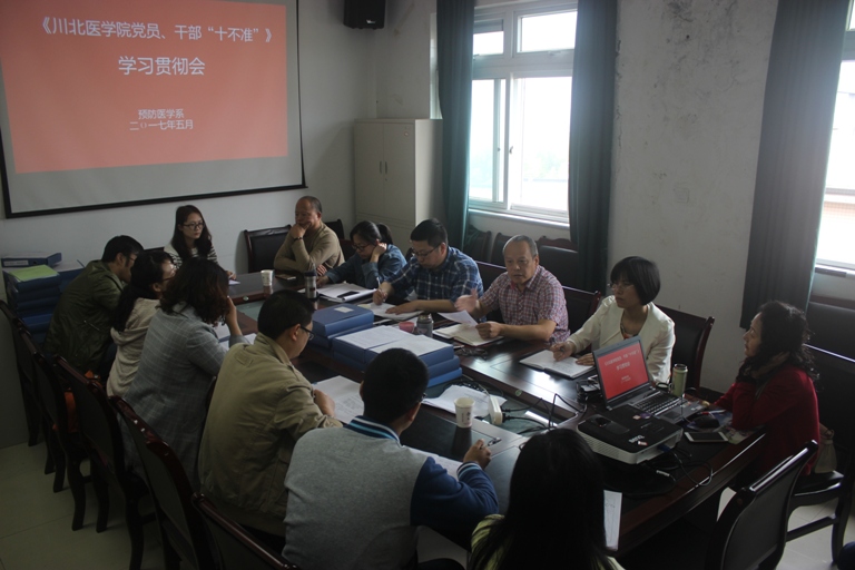 会议首先由赵梓雯传达了川北医纪〔2017〕4号文件(关于深入开展学习宣传《川北医学院党员、干部“十不准”》活动的通知)和川北医纪〔2017〕13号文件(关于印发《川北医学院2017年党风廉政建设工作要点》的通知),高晓凤主任组织大家学习了《川北医学院党员、干部“十不准”》。