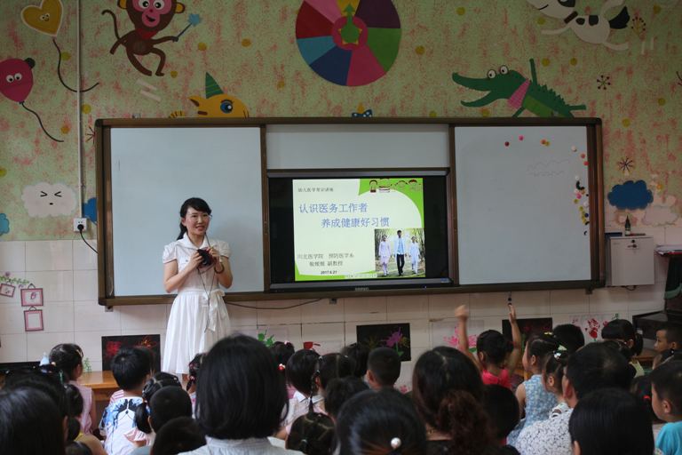 “预携春风十里,予你繁华一树;防樱雨浸幽寒,方赠一叶温情”。为宣传预防保健知识,传播“保护健康,预防为先”的理念,6月22日下午,预防医学系敬媛媛老师和该系10余名2012级毕业生及部分在校学生赴西华师大附属幼儿园,为园区的小朋友、家长以及幼儿园老师等百余人,开展了以“认识医务工作者,养成健康好习惯”为主题的健康知识宣讲活动。