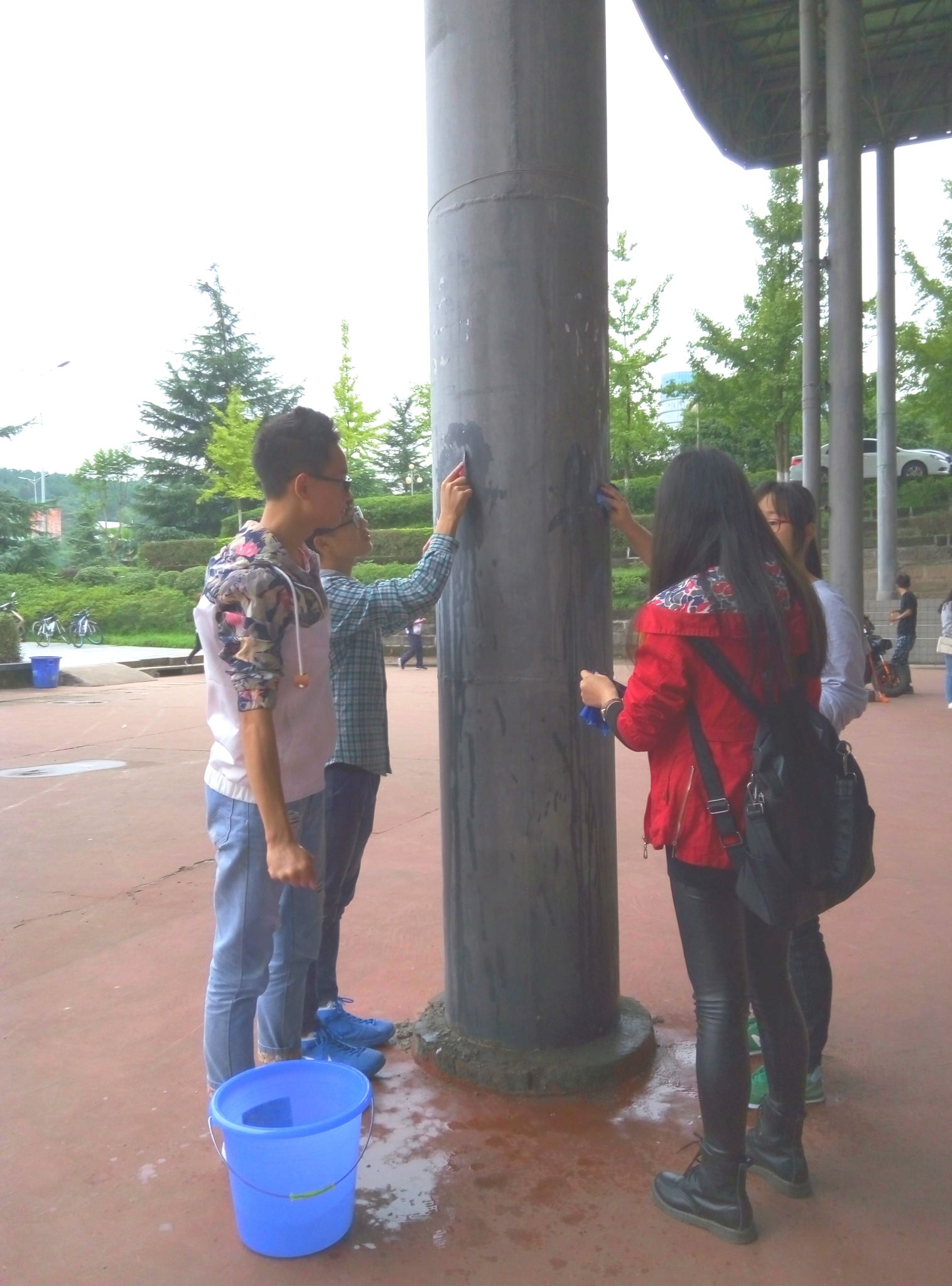 活动伊始,志愿者们就校园布局作出了明确分工,并分发了塑料桶、帕子等清洁工具,确保了活动有序高效的进行。据了解,此次活动分为校区除尘、教区除垢两大版块。志愿者们不仅对校区的所有电线杆,做了全面彻底的打扫,将各种活动的宣传海报等污垢一一清除,还对图书馆信息大楼做了仔细清理,将其所有门窗进行了认真的清洗。