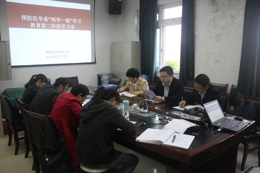 2016年10月27日上午9时,预防医学系全体党员教师在系会议室开展“两学一做”学习教育第二阶段学习会。会议由系党总支副书记赵梓雯主持。