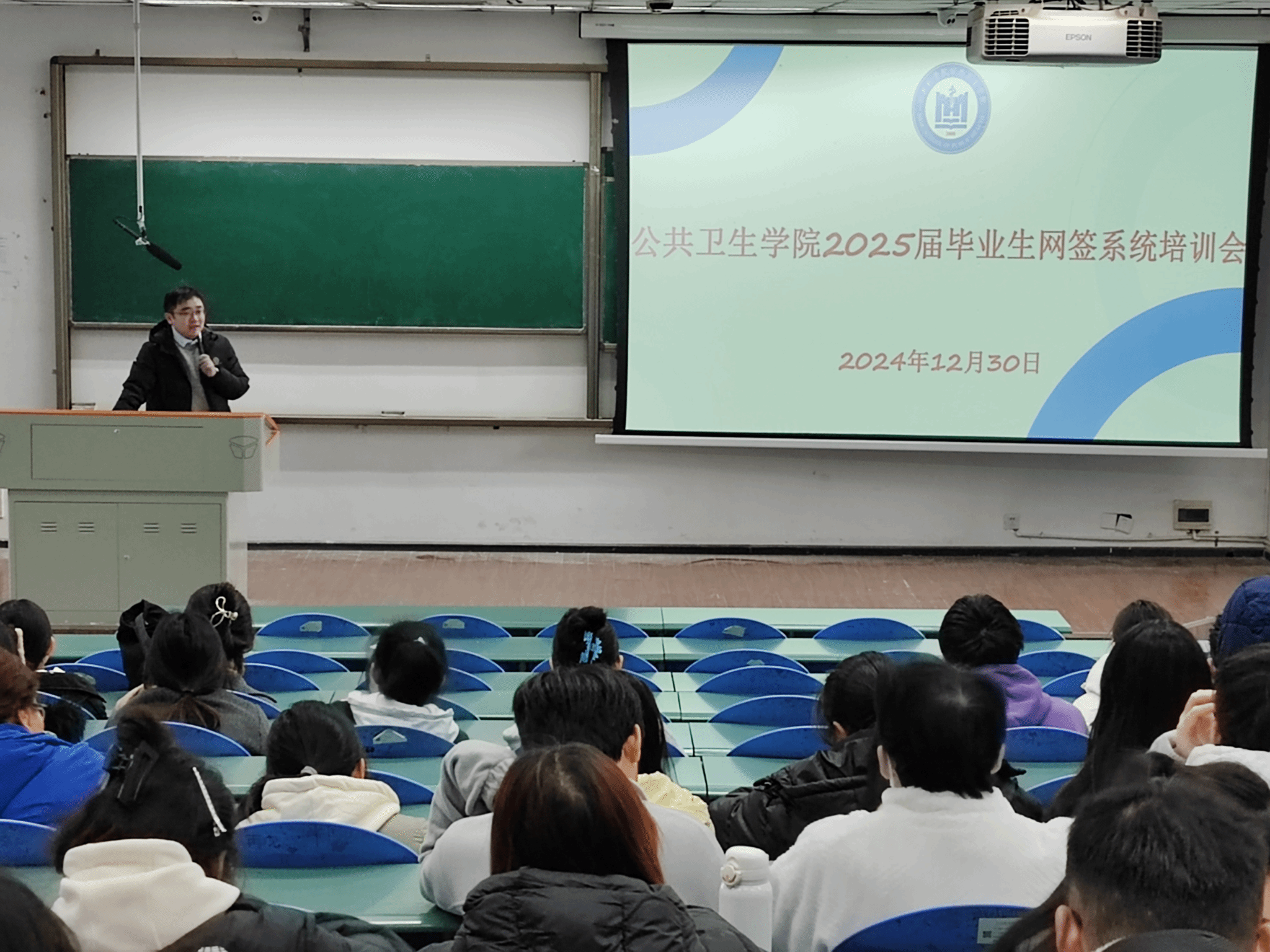 为帮助2025届毕业生更好地了解和使用全国高校毕业生去向登记与网上签约平台,确保毕业生就业信息真实准确,12月30日下午,公共卫生学院在图信楼207教室召开了2025届毕业生网签系统培训会,学院2025届预防医学专业学生参加了培训。