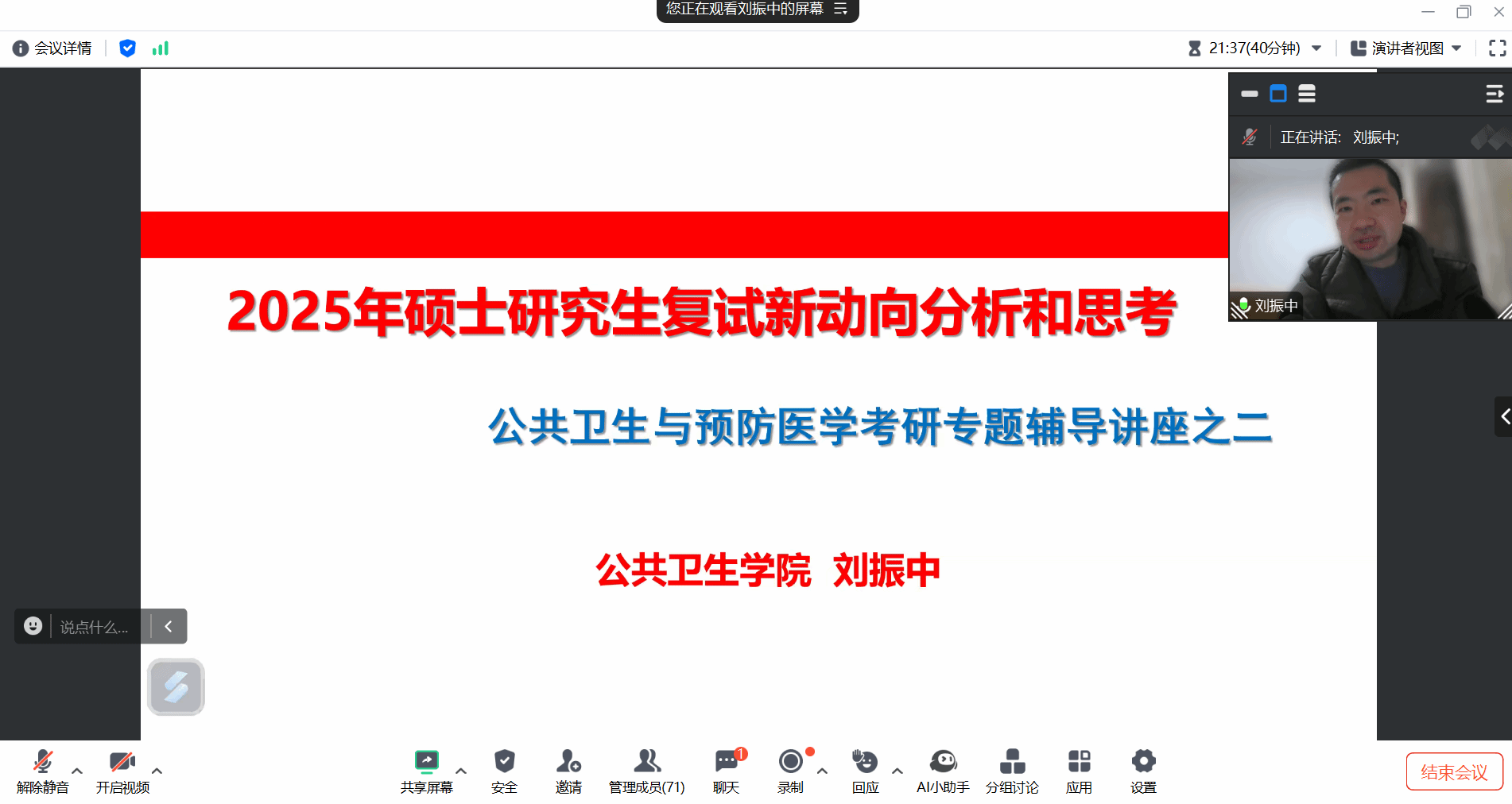 为进一步助力学生备战复试,提升考研上线率,3月4日晚,公共卫生学院在腾讯会议平台线上举办了2025年考研复试指导讲座。学院预防医学专业2025届考研初试上线学生参加了讲座,讲座由公共卫生学院副院长刘振中教授主讲。