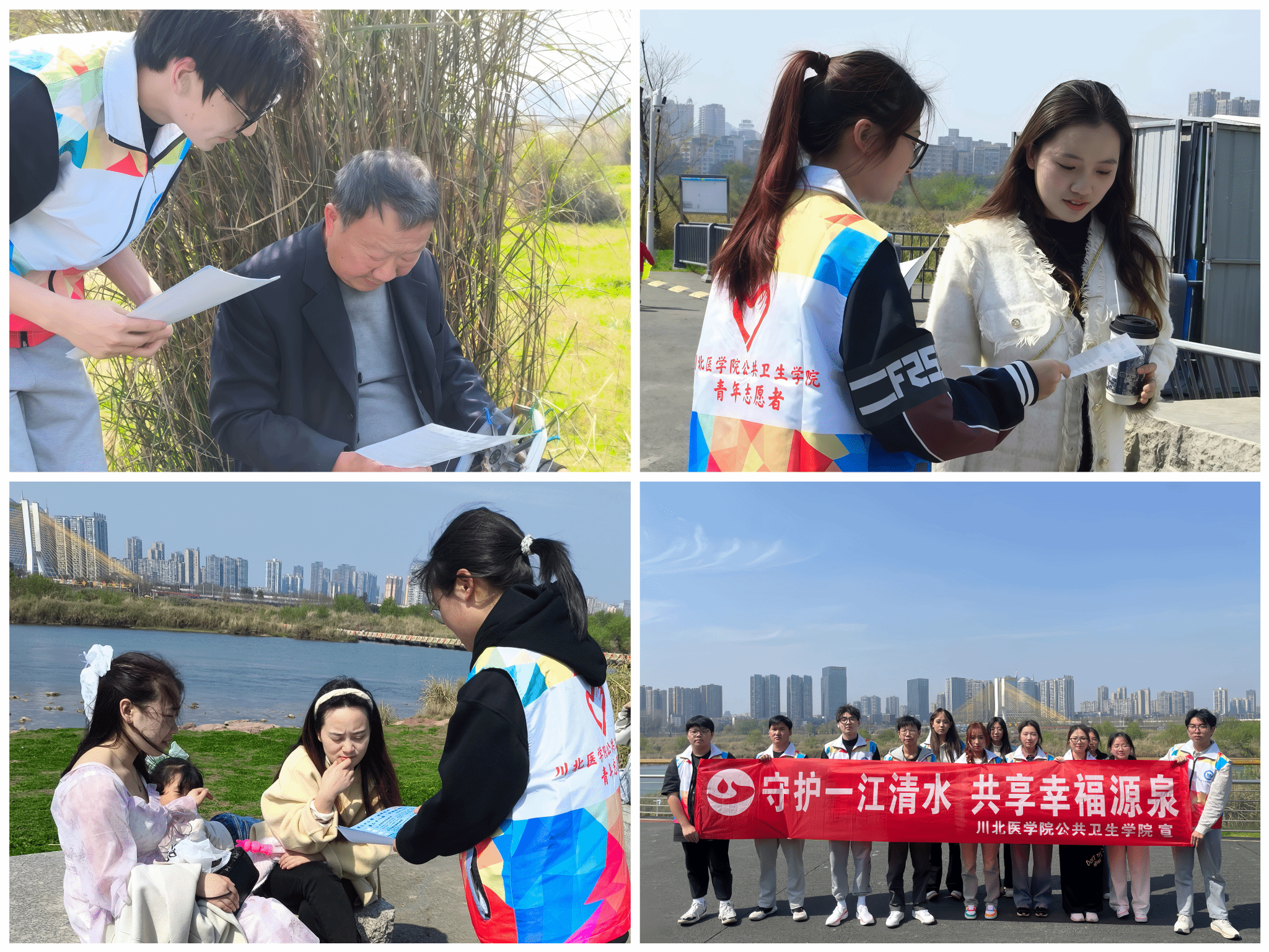 3月22日是第三十三届“世界水日”,3月22日至28日是第三十八届“中国水周”。为践行绿水青山就是金山银山的理念,引导广大青年学子积极投身生态文明建设实践,3月23日下午,公共卫生学院组织20余名青年志愿者走进南充市高坪区印象嘉陵江湿地公园,开展了以“守护一江清水,共享幸福源泉”为主题的志愿宣传活动。