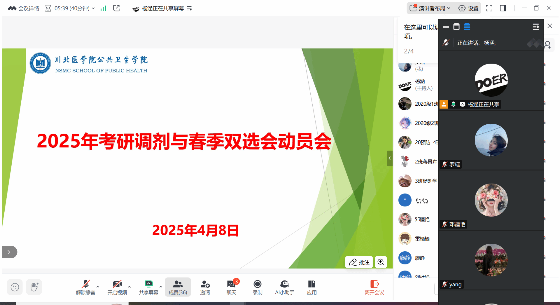 为进一步助力毕业生高质量就业,4月8日晚,公共卫生学院在腾讯会议平台线上召开了2025年考研调剂与春季双选会动员会。学院党总支副书记王翠翠、副院长刘振中、学生科辅导员以及2020级预防医学专业部分学生参加了会议。