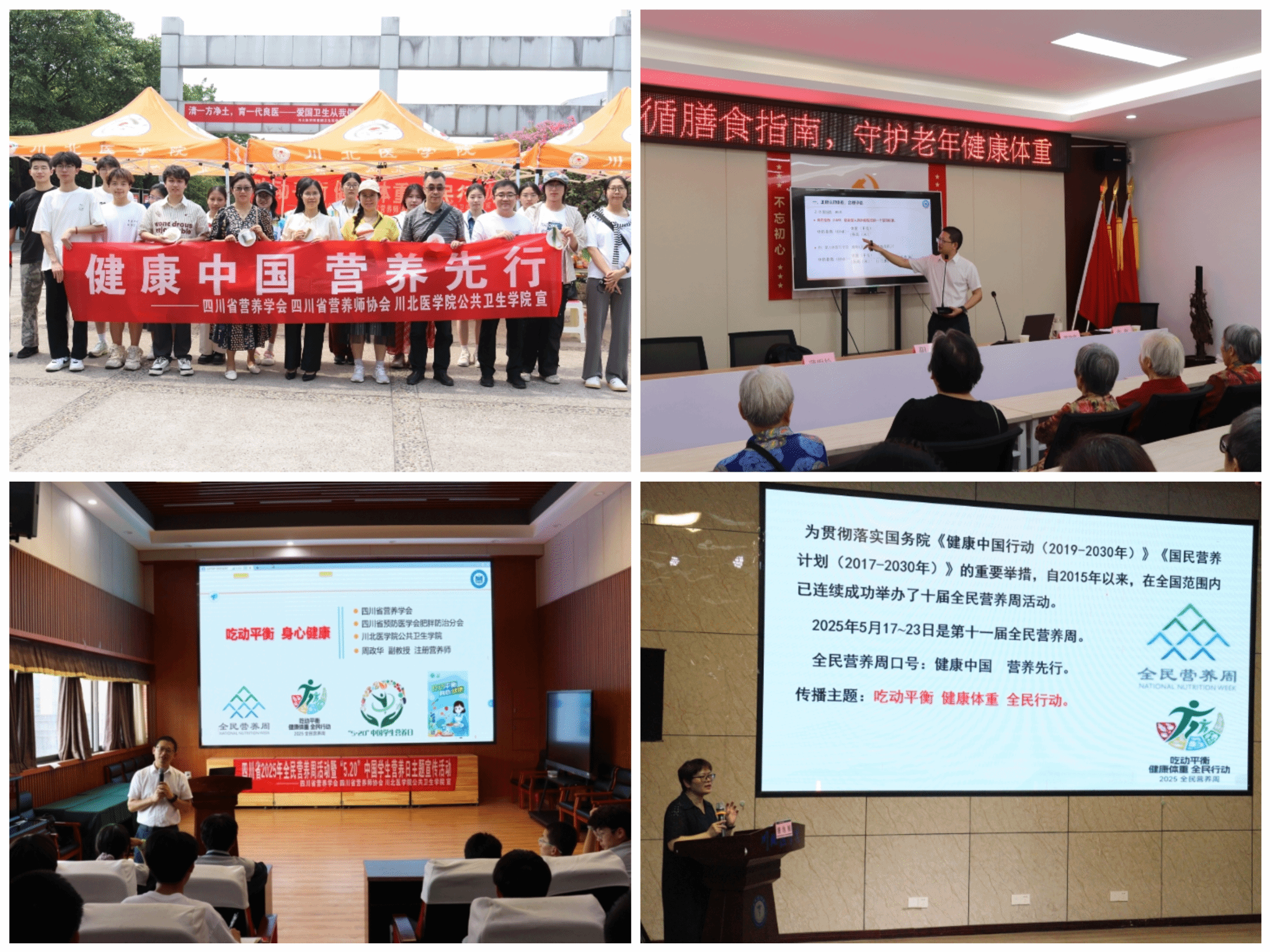 社区服务送健康,专题讲座授新知。5月20日上午,公共卫生学院联合顺庆区舞凤街道社区卫生服务中心开展“遵循膳食指南,守护老年健康体重”为主题的讲座。周政华副教授结合老年人代谢特点,用通俗易懂的语言讲解膳食营养搭配、体质衡量及适度运动的重要性。周政华与学生志愿者耐心教授各位老人测量体脂率,腰围等指标,并现场解读数据;同日下午,周政华副教授带领学生志愿者走进南充五星中学,开展“5·20中国学生营养日”主题宣传。周政华副教授以“吃动平衡,身心健康”为主题,结合青少年成长需求,通过知识讲授、趣味问答和宣传单发放,引导学生树立“健康第一责任人”观念;5月21日晚,学校松林山大讲堂举办了“吃动平衡,健康体重”讲座,潘池梅教授以我国青少年超重肥胖数据为切入点,强调科学膳食与运动的重要性,提出“每日12种、每周25种”食物摄入建议,引导师生养成健康生活方式。