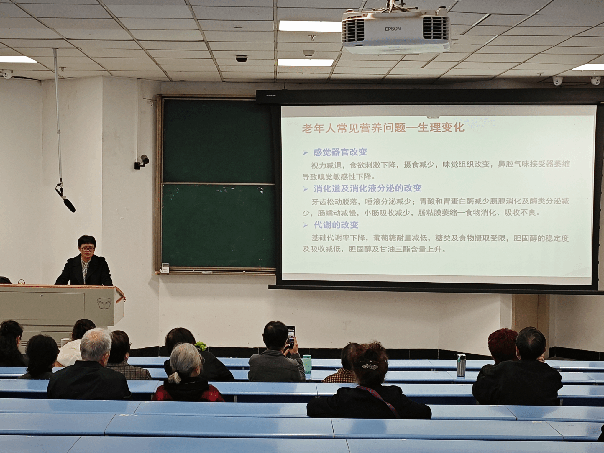讲座中,潘池梅教授围绕“吃动平衡”的核心,结合自身在预防医学、医学营养学领域的研究经验,系统讲解了老年人体重管理的关键知识:从饮食结构的优化、热量摄入的把控,到食物营养的搭配、食物选择及烹饪技巧,再到适合老年人的运动类型,内容实用且贴合老年群体需求。她还结合临床案例,提醒大家避免肥胖与营养不良的双重风险,强调合理饮食与适度运动对降低慢性病概率、改善心理状态的重要性,现场听众认真聆听、不时拍摄记录要点。