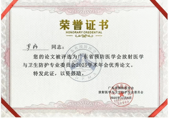 学院与广州市职业病防治院联合培养的研究生罗爽和陈美琳两位同学的研究成果参加了本次学术年会论文评选,罗爽同学的论文凭借方法科学、数据扎实、视角新颖,获评本次会议的"优秀论文”,并在大会分会场进行汇报展示。通过本次会议,我院研究生得以与国内权威专家及同行深入交流,拓宽了学术视野。后续学院和广州市第十二人民医院将继续加强合作,关注放射医学与卫生防护等关键科学问题,进一步优化学科布局、提升育人质量。